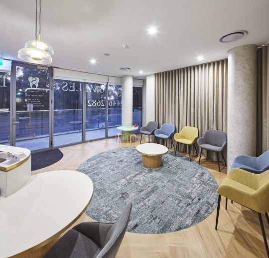 Upon entering Stirling Smiles Dental, patients are greeted by a welcoming reception desk with clean lines and an understated elegance that sets the tone for the rest of the practice. The waiting area features comfortable seating, ambient lighting, and a curated selection of reading materials, ensuring patients feel at ease while they wait for their appointments. A curved curtain wall and circular floor features help soften the space, whilst curved bulkheads and arches provide an architectural focus.
