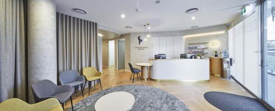 The walls are textured with a light grey marble wash that complements the overall design aesthetic, while large windows allow natural light to flood the space, creating a bright and airy atmosphere. The use of plants and greenery throughout the waiting area further enhances the sense of serenity and calm, providing patients with a much-needed respite from their busy lives.