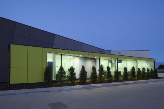 The building is single storey, yet presents as a larger built form through raking walls in a contemporary design. From the street, the building seems to rise up out of the ground, the sweeping angles reminiscent of a mighty ark. The sides of the building are clad in graduated tones of grey to accentuate the dramatic elevation while bold panels of yellow, purple and white provide a vibrant contrast and articulate the architectural forms. The effect is stunning, giving the practice a unique visual signature.